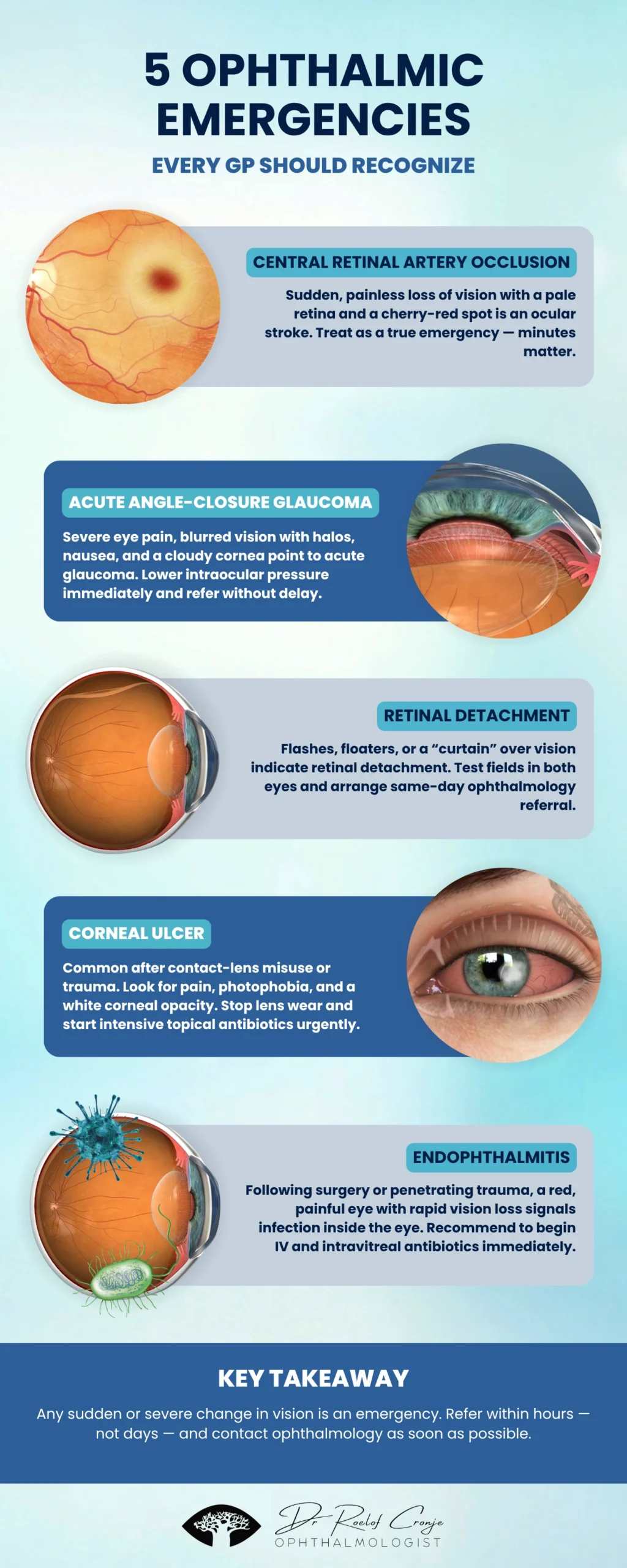 This practical guide outlines the five most critical ophthalmic emergencies every GP should recognize, what to look for, and what immediate steps to take before referral.