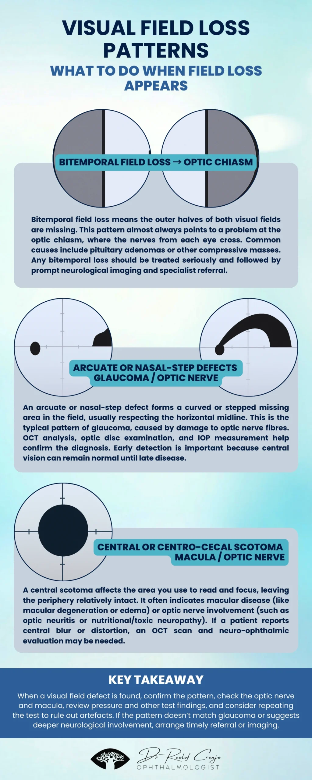 Visual field testing remains one of the most under-utilised diagnostic tools in general practice and optometry. But when interpreted through the lens of anatomy — bitemporal for chiasm, arcuate for glaucoma, central for macula/nerve — field defects become powerful localising tools.
